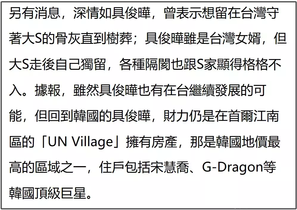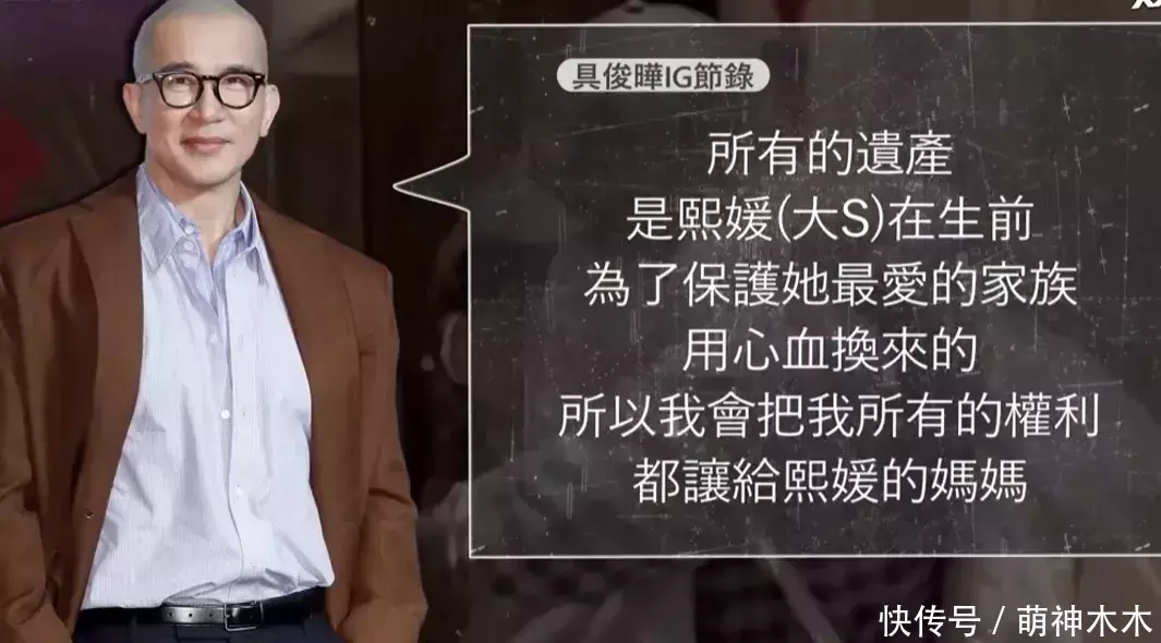 大S刚去世,就有律师分析大S的官司将会由继承人代她继续打下去。当时都猜测是具俊晔代大S打官司,因为他是第一继承人,但如今台媒报道称他似乎有回韩国老家的打算,此前他还发文称要放弃继承遗产,如今看来似乎是不想趟S家的浑水。