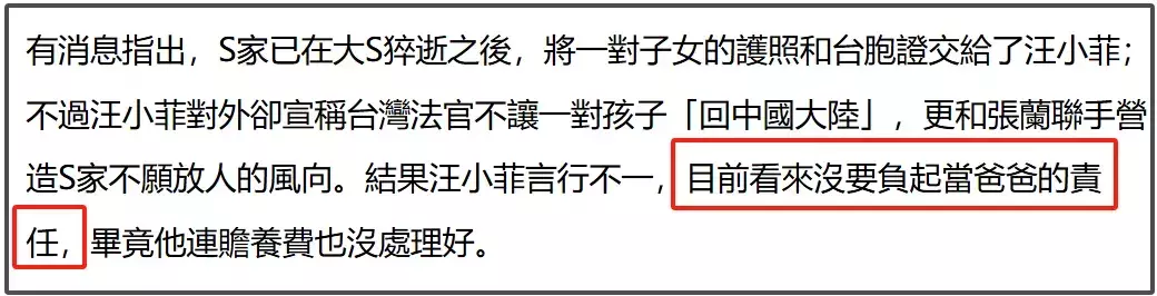 多次强调S家把孩子们的台胞证给了汪小菲,但他元宵节没带孩子回北京,而是和新婚妻子回去过情人节享受二人世界去了,指责汪小菲看起来没有负起当爸爸的责任,这是想争孩子抚养权了?争下来似乎大S的钱就落不到汪小菲身上了。