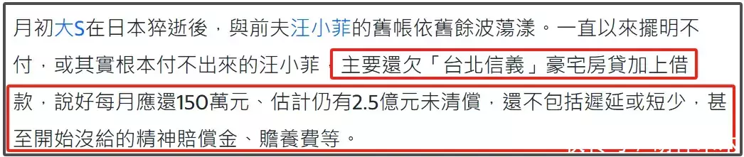 近日,台媒连发多篇报道指明S妈要向汪小菲追债,并算了一笔账,称汪小菲欠前妻2.5亿,其中包括豪宅房贷、借款、大S的赡养费、精神赔偿金等。