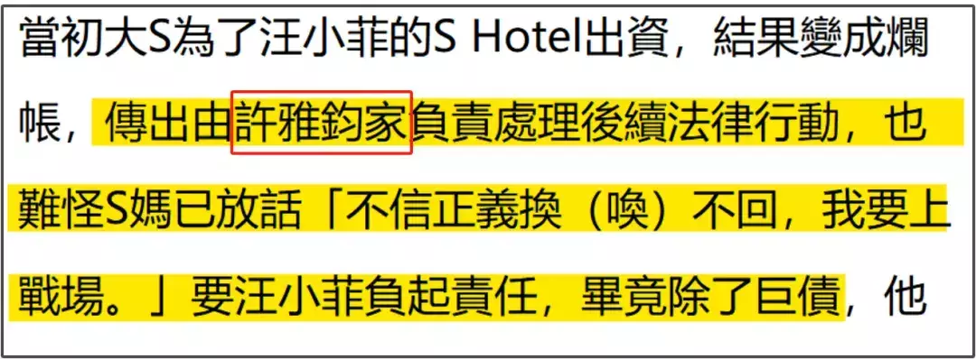 如今S家似乎要替大S继续向汪小菲追讨,台媒爆料称由许雅钧家处理后续法律行动,看来小S也有参与这场遗产大战。